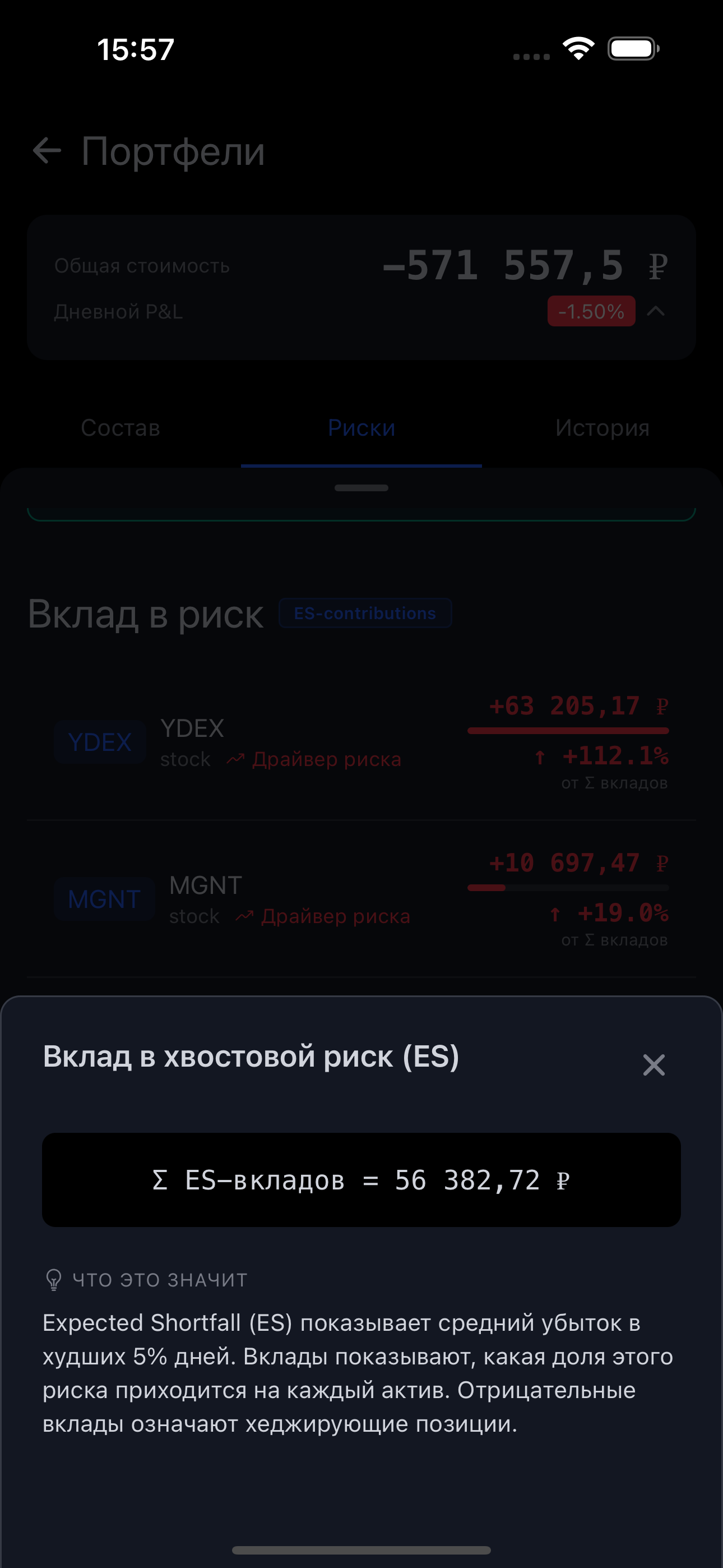 $$\text{ES}i = -w_i \cdot \mathbb{E}[r_i \mid r{\text{портфеля}} \leq -\text{VaR}]$$