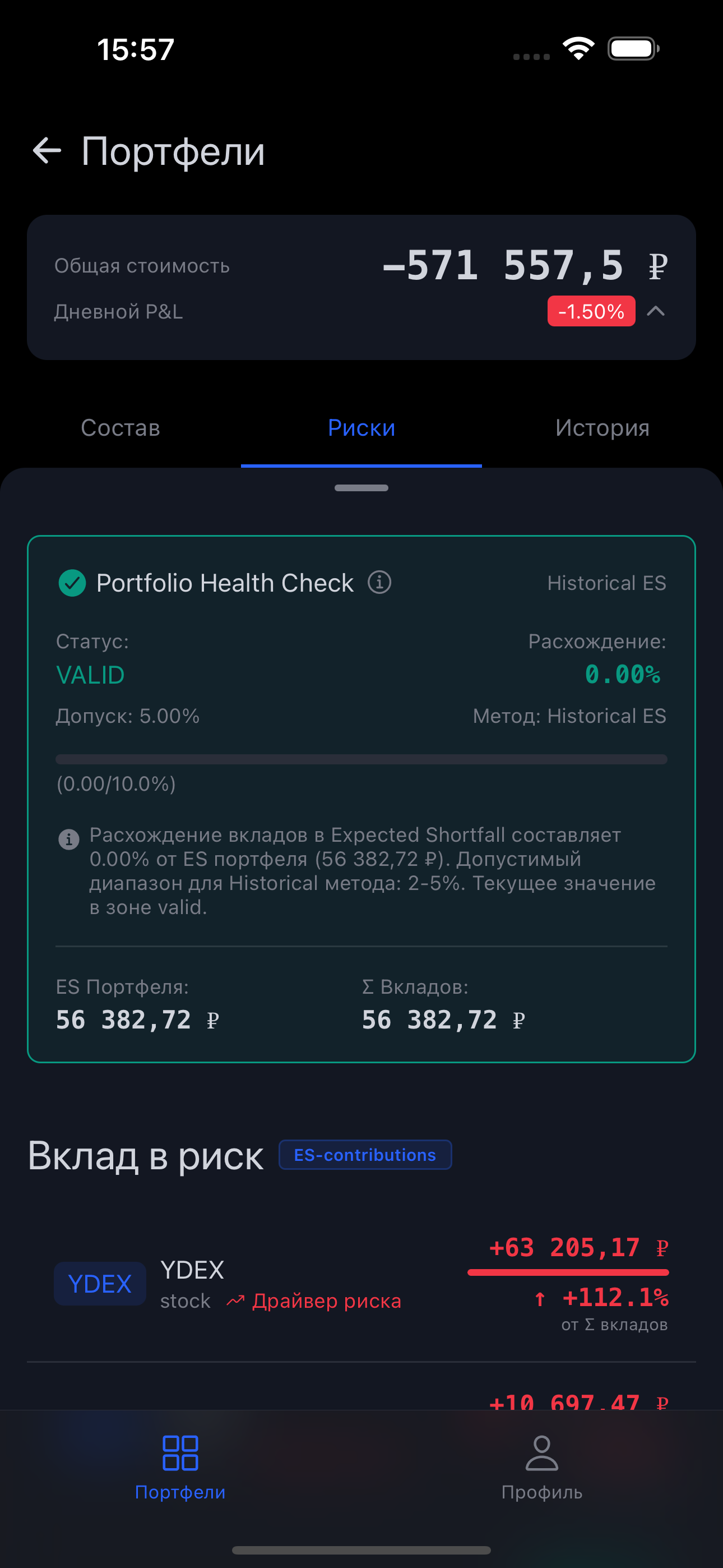 Portfolio Health Check — это проверка математической корректности расчёта рисков вашего портфеля. Система проверяет, что сумма индивидуальных вкладов каждого актива в риск равна общему риску портфеля.