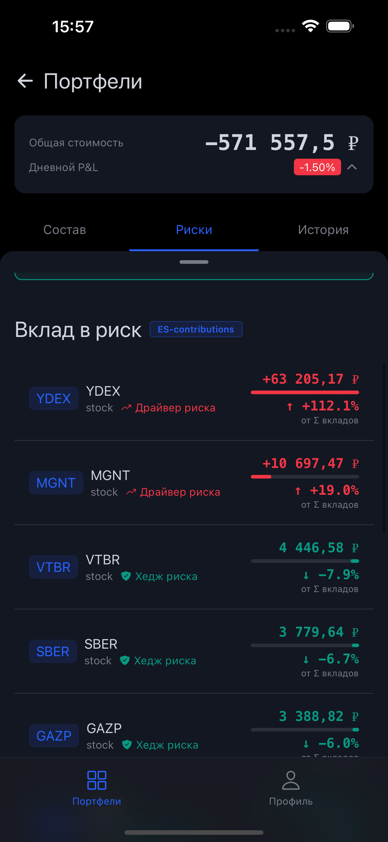 Когда вы видите, что GAZP вносит +45% в риск портфеля, а LKOH +26% — важно быть уверенным, что эти числа математически корректны и в сумме дают 100%.